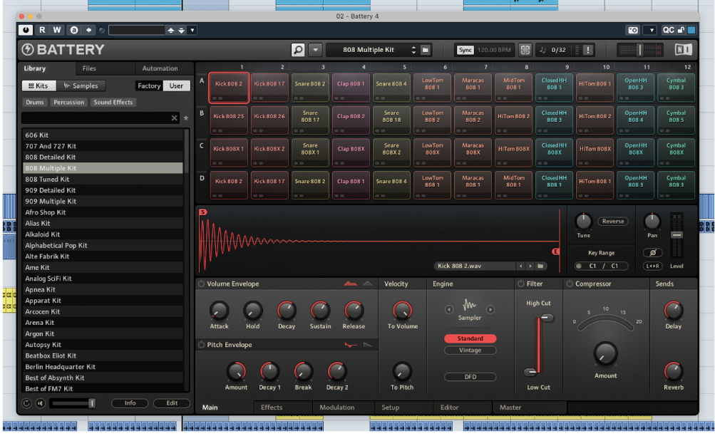 For main drum kits I usually use NI Battery 4. I ask constantly other producers, on what frequence hz you have your kick peak, but usually they can’t answer. Peak is 50hz, in pop or house music, so for this Battery 4, 080 Multiple Kit is ideal for kick. It has perfect 50hz.