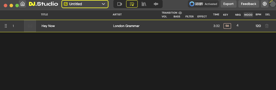 I uploaded my old MP3 of “Hey Now” by London Grammar into DJ Studio. The software analyzed it, labeling the key as 5A and identifying the BPM. This information helps in finding the right songs to pair with during the mashup process. Now, I’ll search Rekordbox for songs in the same key.