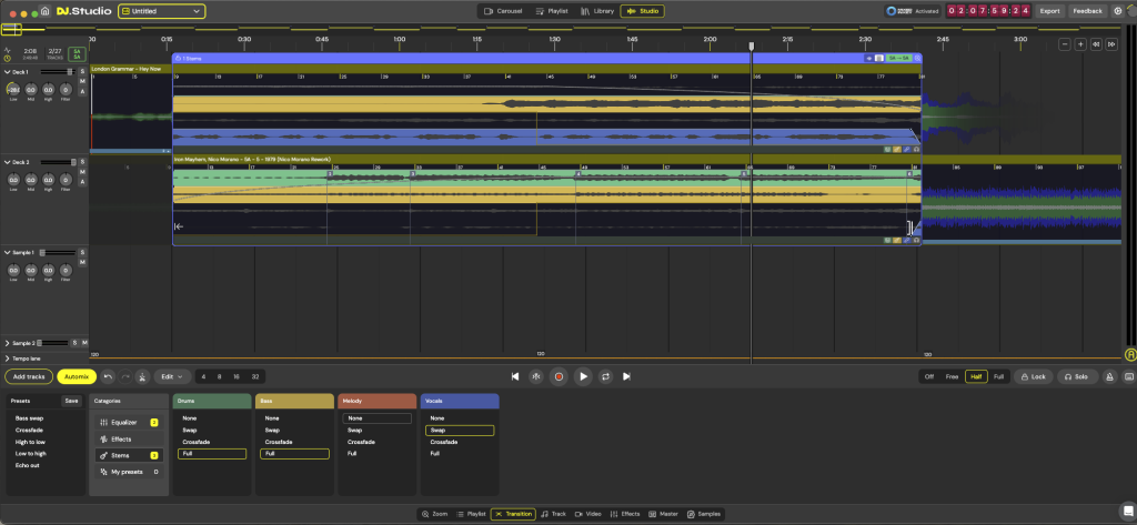 Once you’ve selected the songs, open the Stems functionality in DJ Studio. This feature lets you switch between the main layers of each song, focusing on vocals from one track and the instrumental from another. For example, you could use the guitars or drums from “Hey Now,” but here, I’m using just the vocals while keeping the groove, drums, bass, and other elements from the instrumental track.