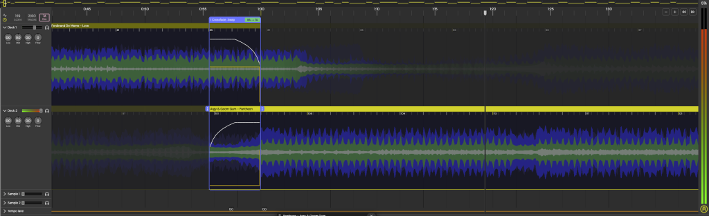 Normally, when making DJ mixes, I rely on longer transitions, usually over 32 bars or more like you can check out in the promo mixes I put together using the same software at the end of this section, which is about a minute of song time. For a power hour, we need much quicker transitions.