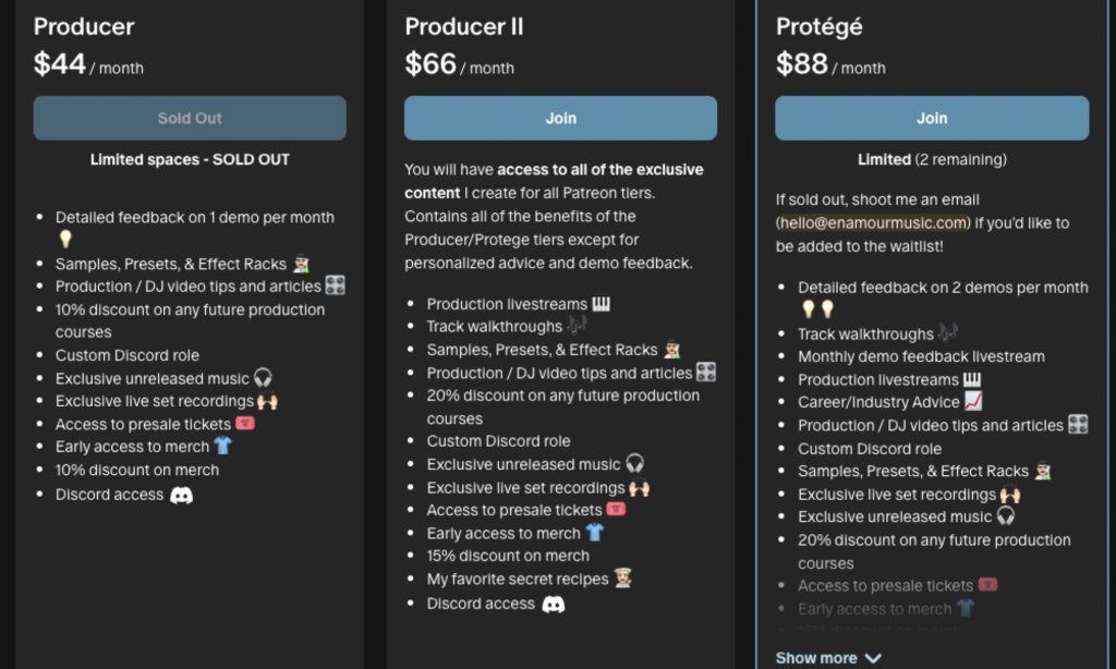 Enamour has an amazing Patreon that offers access to him and his knowledge base in exchange for monthly subscriptions. What makes him so popular is a combination of overdelivering on what’s offered each tier and his reputation as one of the most technical producers in the melodic house and club-music space. If he didn’t have hits on some of the top labels in the game, it might be harder to pull off, but he did it easily.