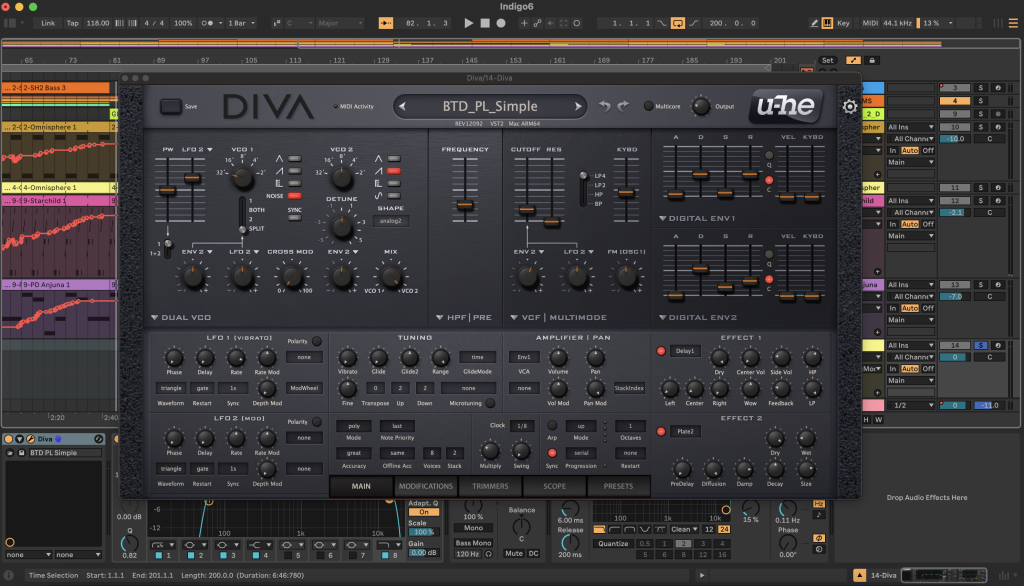 My track Indigo on my newly released album Soul Motion [out now on Emergent Properties] has quite a few different synthesisers and effects used to make the overall texture of the track. Diva is one of them that makes a very characteristic saturated pluck sound that has a host of effects and automation. Diva is an all around software synthesiser that just sounds amazing. It has a classic rich analogue sound modelled from a number of retro synth hardware units. Also you can mix and match different synth model oscillators, filters and envelopes independently to create very unique results.