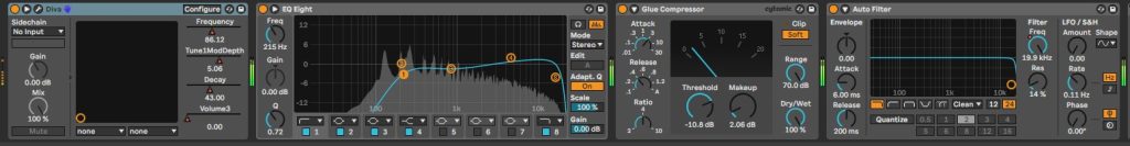 I always use EQ Eight for quick, basic EQ tasks in my projects, like cleaning up the low end and removing resonances from each channel. The Glue Compressor is another go to, as the name suggests, it really helps to ‘glue’ sounds together, giving them more presence in the mix. I also love using the Auto Filter effect to automate the cutoff and create smoother transitions, which adds a nice dynamic flow to my tracks.