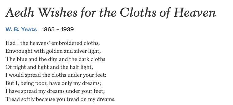 Drawing a subtle parallel to Yeats’ “Aedh Wishes for the Cloths of Heaven,” it’s evident that both the song and the poem celebrate the profound depth of love and human connection over any attachment to divine intervention or celestial ordning. Just as Yeats weaves his dreams into cloths to offer to his beloved, the song emphasizes that true peace and heaven are cultivated through meaningful and enduring connections rather than external idealizations. It’s another short one, so I’m going to include a picture of it as well, courtesy of my second favorite poetry site!
