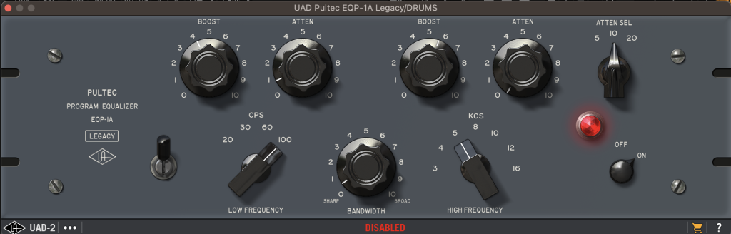 This is an analog sounding EQ modeled from the real thing by UA. It’s gives drums a great boost!