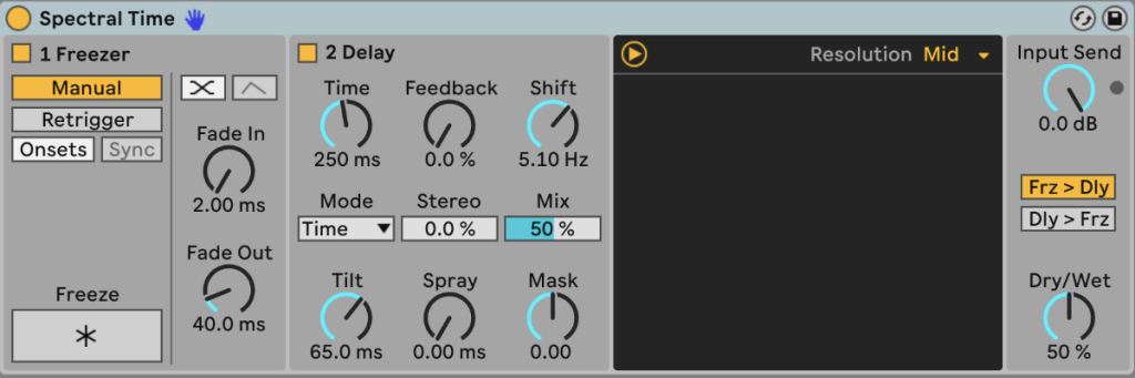 Long Live Stock Ableton Audio Effects! With this effect you can add delay to different areas of the frequency spectrum, which is how I got the sweeping sound in the synth during the drop. The ‘Tilt’ knob is the secret to that – positive values delay the upper frequencies more than the lower ones, and negative values add more delay to the low frequencies rather than higher ones.