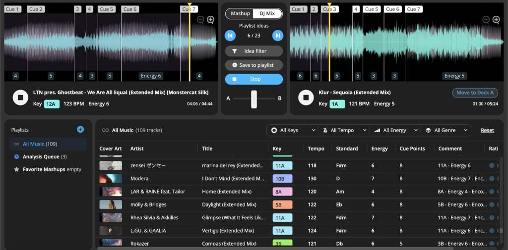This feature is exactly why Pro is getting an Editor’s Choice Award. After you load a track into Deck A, it will quite literally bring up songs that you have in your library that will mix into that song well in a set based on energy, key, and BPM. You can play both songs at once to see if they’ll transition well, then save to a playlist. You can do this several times until you’ve saved enough songs for however long of a set you’ll need.