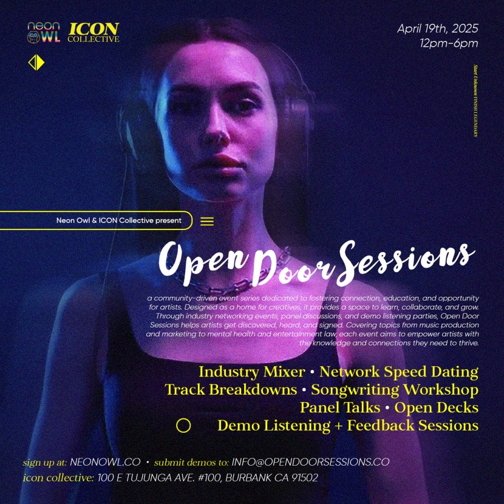 On April 19, Neon Owl brings its flagship Open Door Sessions (ODS) to Icon’s Burbank campus, offering panels, songwriting workshops, industry mixers, demo feedback, and track breakdowns for artists. It’s a major moment for Neon Owl founder Elaine Huang, as ODS have led to label signings, festival bookings, and career-changing collabs—inviting past panelists such as Andrew Rayel, Gene Farris, and Habstrakt.
