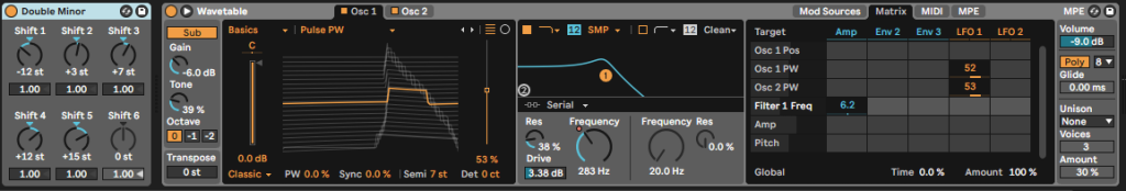 The patch is made from two Pulse Waves, with the first one pitched up seven semitones to give it that classic minor feel. The filter is modulated, and the waves themselves are being shaped by two LFOs to add subtle movement and texture. Since the synth runs through most of the track, I put a lot of attention into the MIDI – particularly velocity and pitch – to keep things from feeling static. I used Ableton’s Chord device to add extra notes and build a kind of double minor chord, which helped give it a lush, harmonic feel.