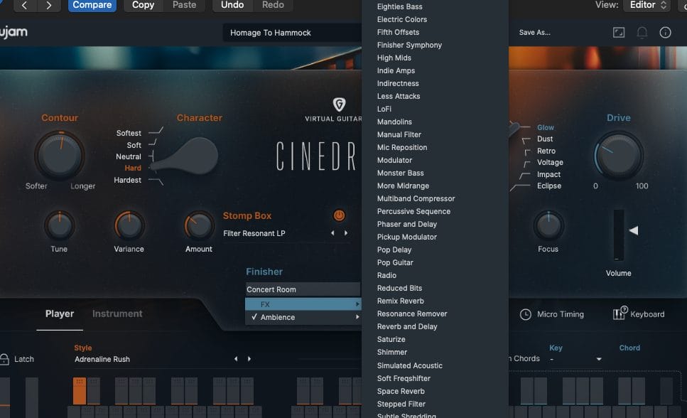Lastly, the Finisher adds a final effect to your sound. These range from massive reverbs to something close to a trance gate. Just like with the stomp box, it’s worth playing around with these. There are so many (as you can see), and they can turn your guitar from a guitar into an unintelligible sound. The real fun in this plugin happens with this knob.