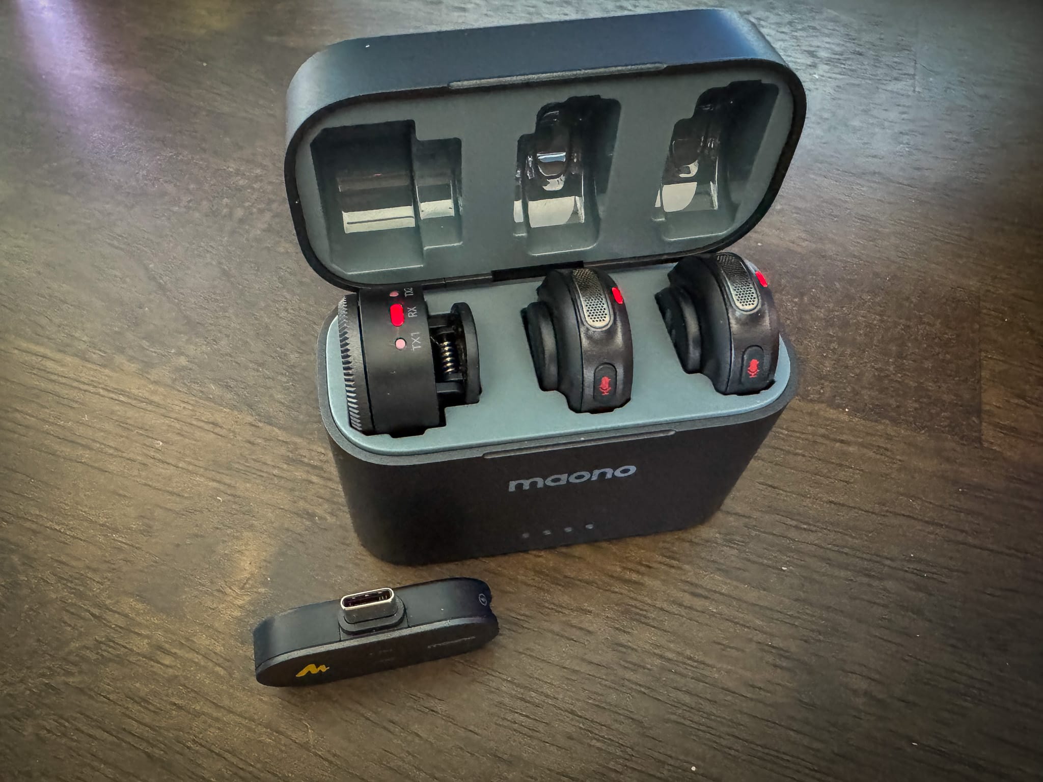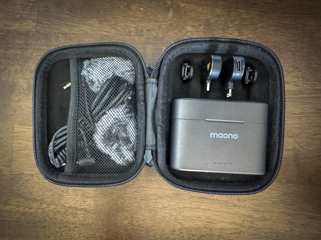 The magnets are strong, the hard case is molded and secure, and the charging case has a reassuring weight to it with LED indicators that actually make sense. Maono didn’t skimp on the details—this feels made for creators who are moving fast and need their gear to keep up. The only gripe is the windscreens; they are just a little wonky, and higher-end systems like DJI, RODE, etc. have better and more secure options.