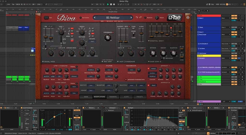 For Motor City, we used Diva to create the synth bass you hear during the break. The goal was to get a tone that felt metallic, slightly aggressive, and full of harmonic presence without overpowering the rest of the mix. We started with one preset called BS Nekkar then tweaked it with EQ and compression to shape the tone further, and we added a small amount of reverb to tuck it nicely into the space. It cuts through the mix with bite.