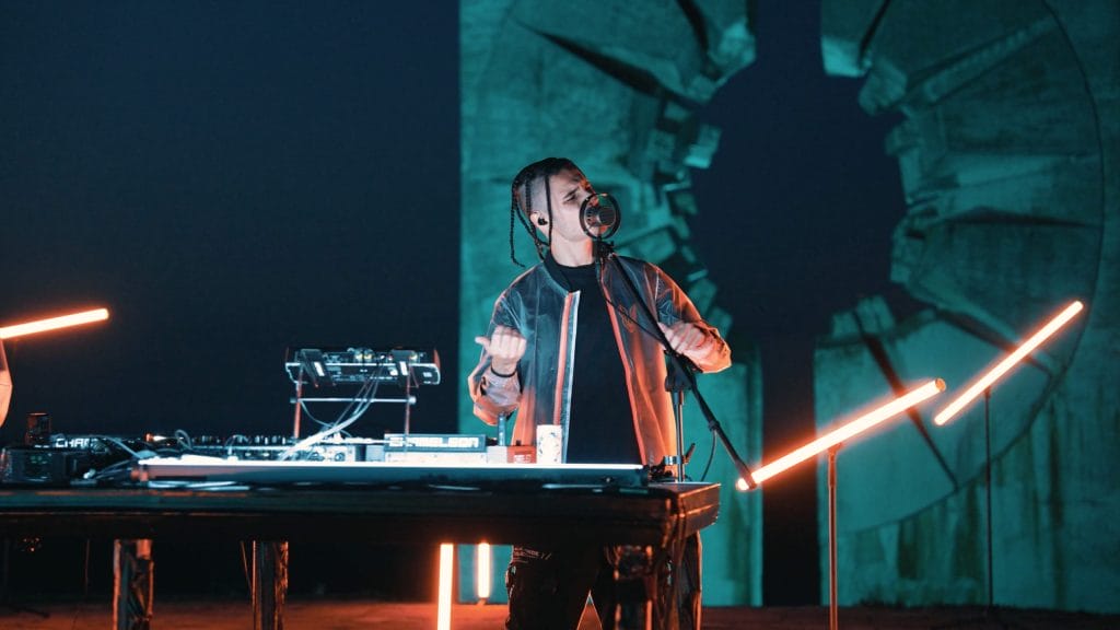 This was by far the most demanding shoot we’ve done: no electricity, no signal, no shelter. Everything had to be prepared in advance—power generators, wireless monitoring, mobile lighting, and team communication. The entire audio was routed through our HYBRID setup: analog synths, live vocals, drum machines, effects processors, and Ableton for sequences. Everything was connected in a way that allowed full real-time control.