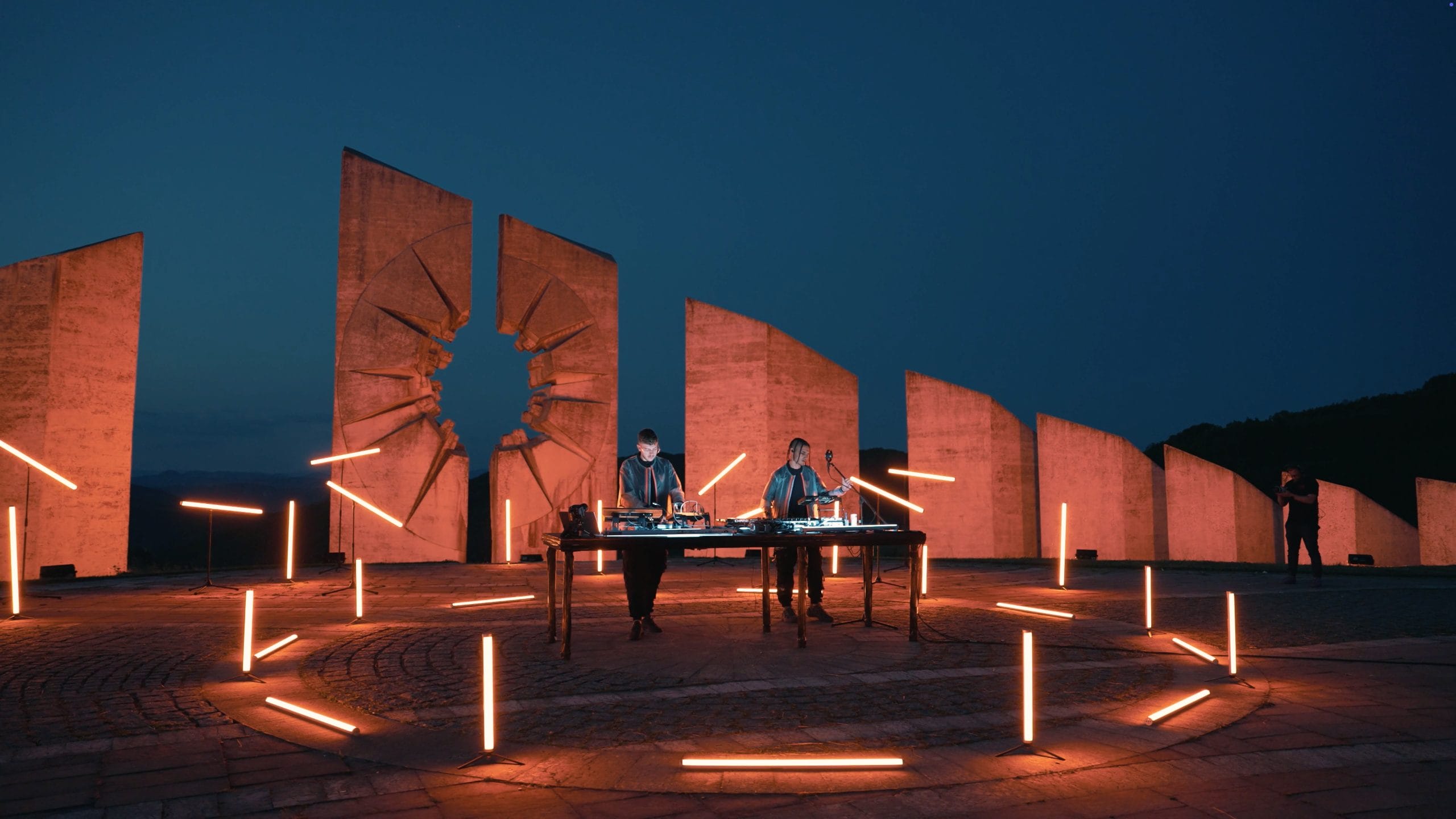 There’s a level of pressure that comes with filming a live set at a war memorial with no power, no shelter, and no safety net—but UTOPIA make it look like second nature. For their latest hybrid live performance, the Serbian duo didn’t just pick a striking location. They committed to it, hauling a full analog and digital rig into the brutalist sprawl of Kadinjača and turning the site’s monumental stillness into a living part of the set. No crowd. No external PA. Just cold stone, sunrise light, and a sound system routed entirely through their own hands.
