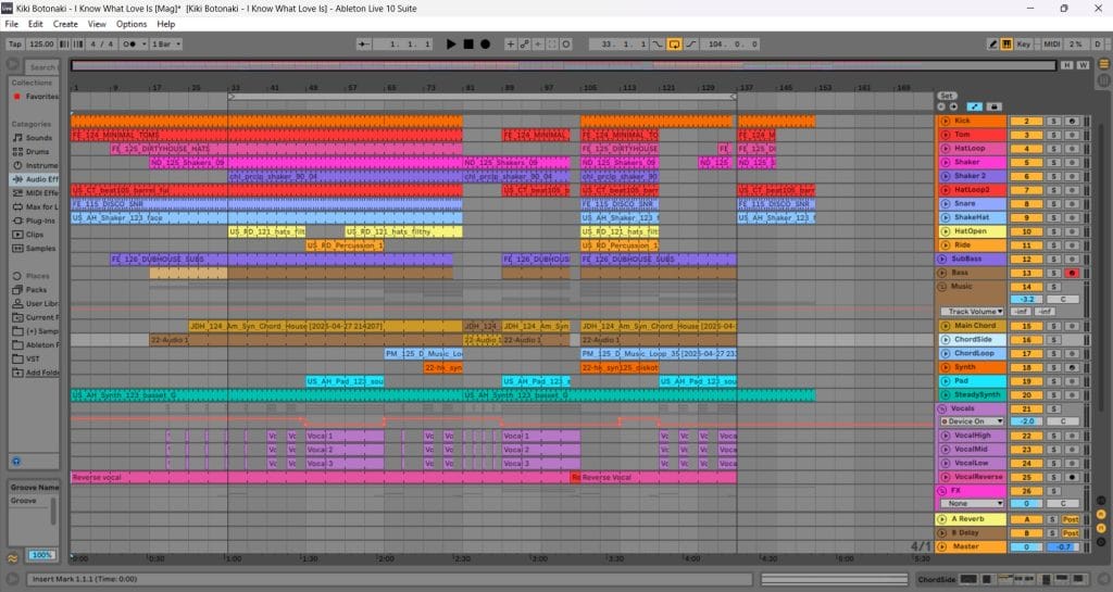 Applied light EQ to enhance natural sound, giving depth and air with a reverb. I also used an Auto Filter at select moments to introduce a warm, slightly muddy texture for added character. A reversed loop of the vocals was used as additional FX giving a chaotic essence at the end of each 4-bar section.