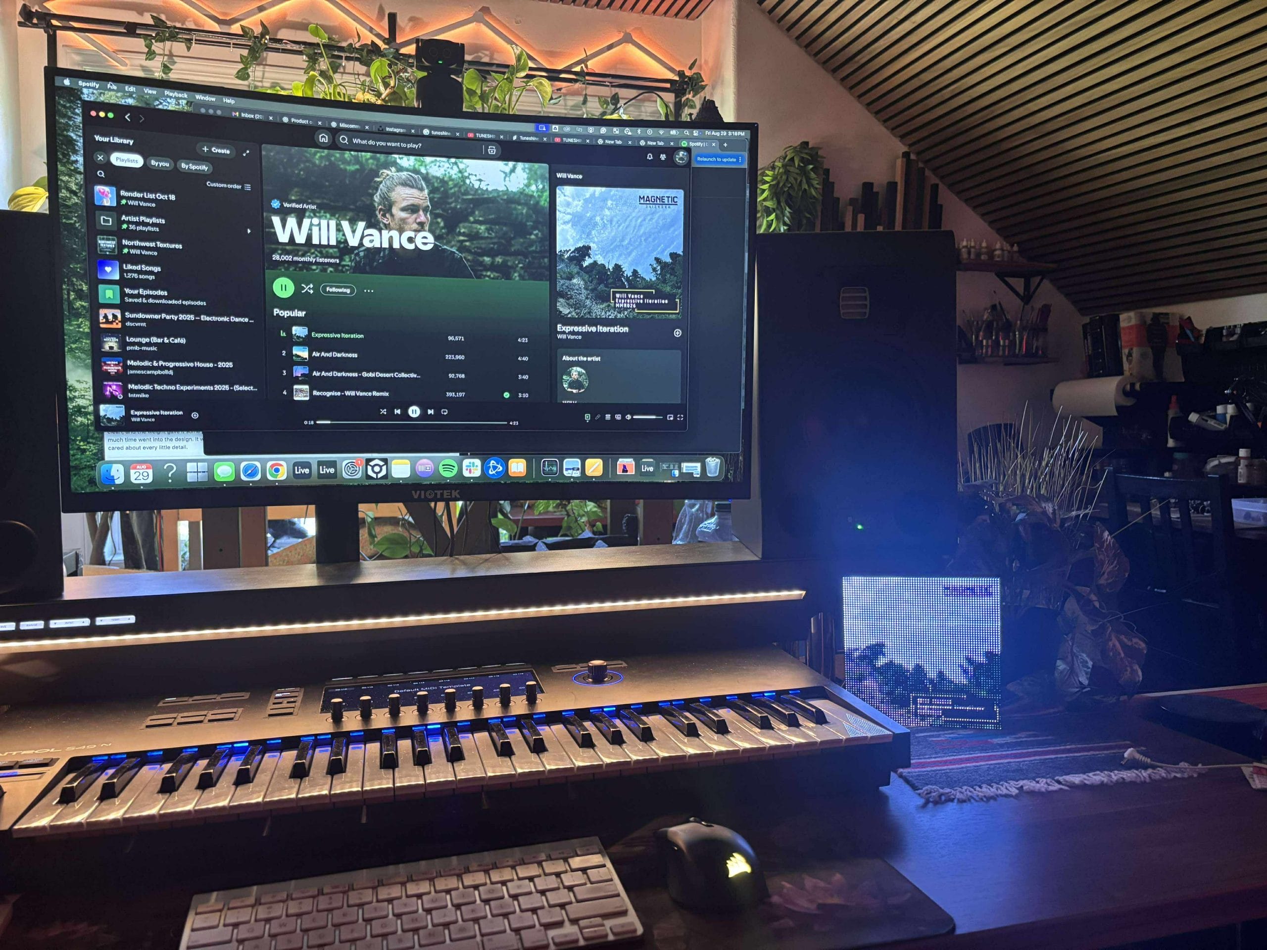 On the desk, Tuneshine looks like it belongs. The size hits the sweet spot — small enough to sit alongside speakers, controllers, or whatever else you’ve got, but large enough that the artwork is visible across the room. Guests have noticed it right away, sometimes before noticing bigger gear in the room. That says something about its presence.
