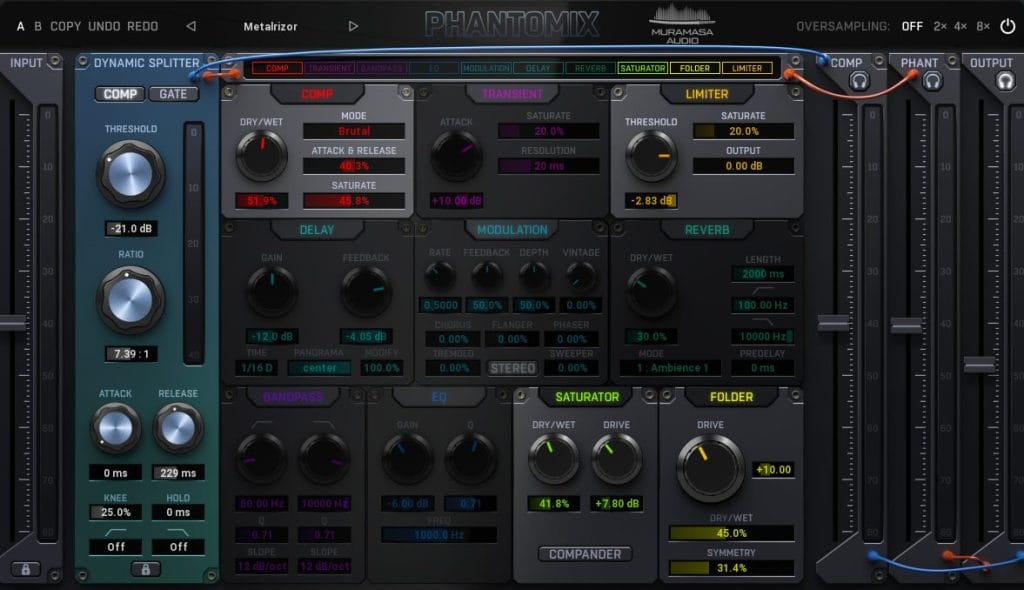 After this all gets processed, you can mix together both the compressed sound and the “phantom” (the signal that ran through the effects chain) by using the level sliders on the right hand side, and then adjusting the output signal.