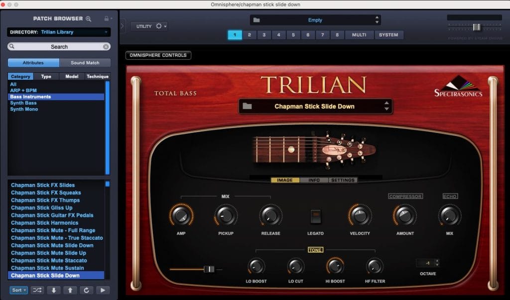 The melodic stab, also sourced from a sample library, was meticulously edited to become the track’s emotional backbone. We refined its texture and timing to craft a percussive yet melodic element that weaves between rhythm and harmony, giving the track its distinctive character. To anchor the low end, we used Spectrasonics Trilian VIP’s Chapman Stick Slide Down preset for the bass, which brought organic warmth to the mix, perfectly complementing the stab and vocals.