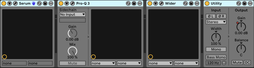 LiveHorns (recorded live) and InstrHorns (pre-recorded) tracks have identical processing chains, like the bass. The horns’ sound is almost exclusively Serum from Xfer Records using “LD Titan” factory preset, with just a light Pro Q from FabFilter low-cut filter to remove the low end along with Wider from Polyverse to expand the sound in the stereo field. And at the end, I automate some volume changes in sections of the song where the horns are little too bright.