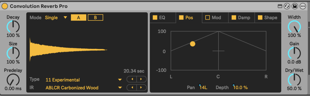 But when I don’t process through the Tasty Chips ECR convolution reverb in the eurorack setup I love to get creative with different IRs using the simple but effective Convolution Reverb Pro in Ableton Live. There are a lot of sonically interesting things you can do with IR if you stop thinking about it purely as a reverb.