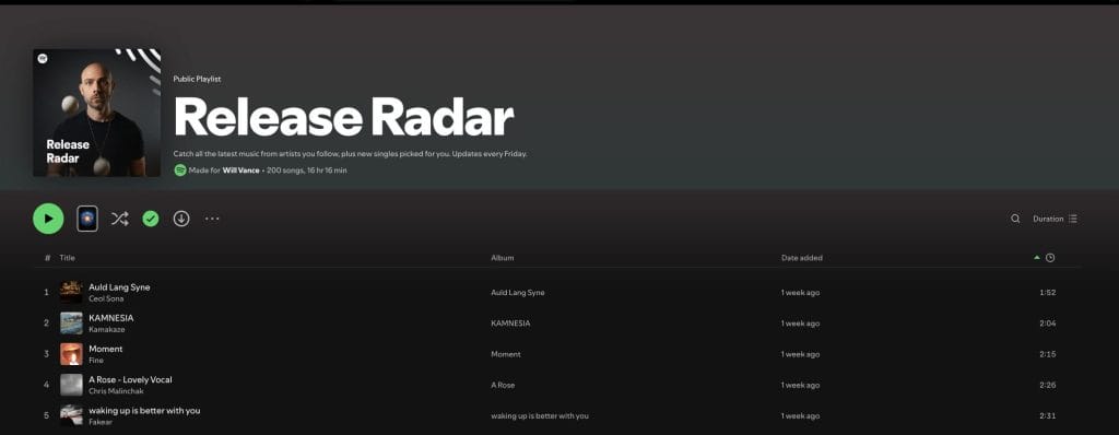 Algorithmic playlists like Release Radar, Discover Weekly, and various “Radio” feeds are driven by listener behavior. That is why all the earlier work on skip rates, saves, and launch week engagement matters. You cannot directly pitch these, but you can feed them. If a track does well with your followers, Spotify will start testing it with people who listen to similar artists.