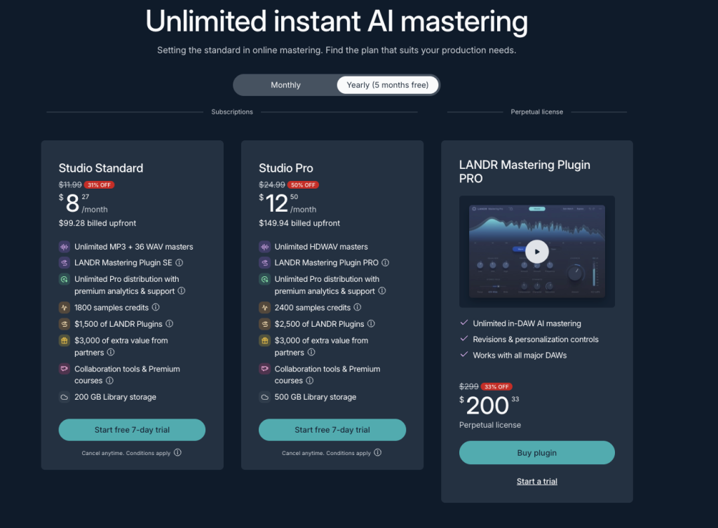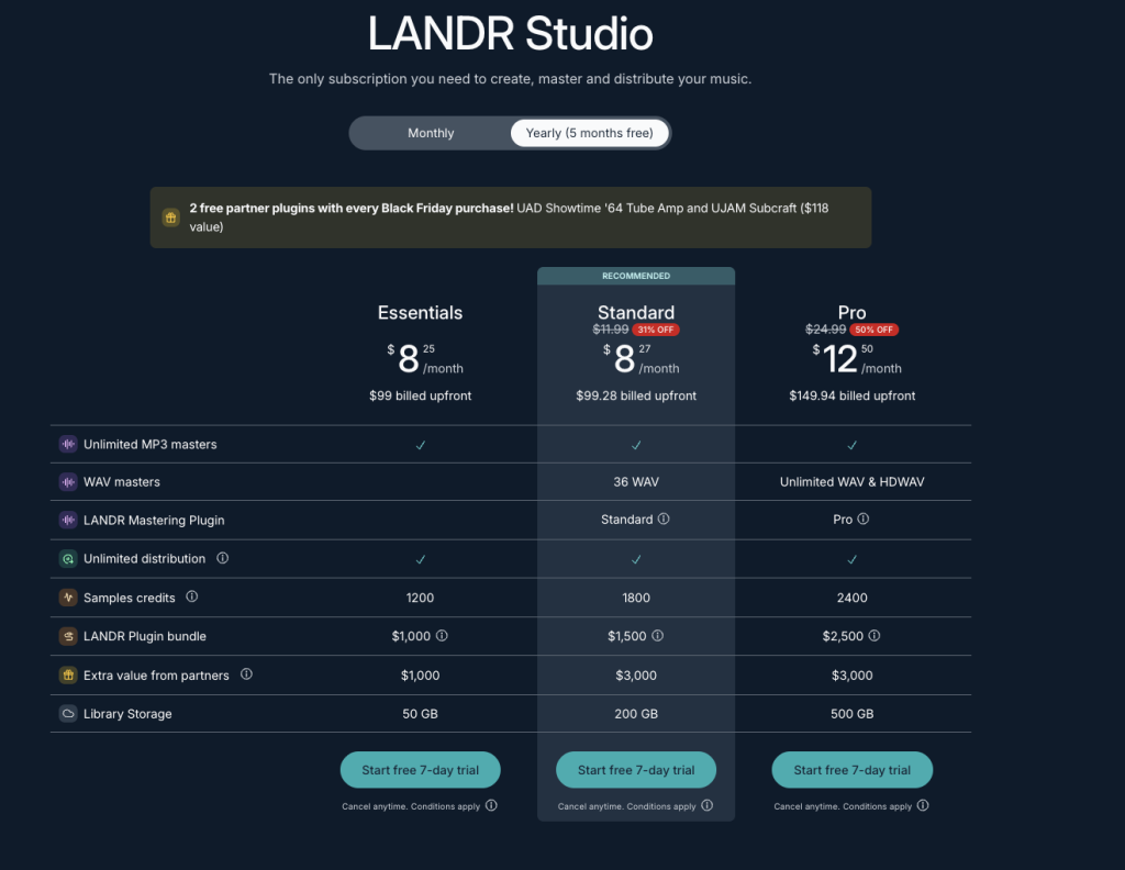 Across the site, LANDR is running up to 50% off on Studio subscriptions, distribution plans, samples and plugin bundles. Studio Essentials, Studio Standard and Studio Pro all come in at discounted yearly rates and include a mix of:
