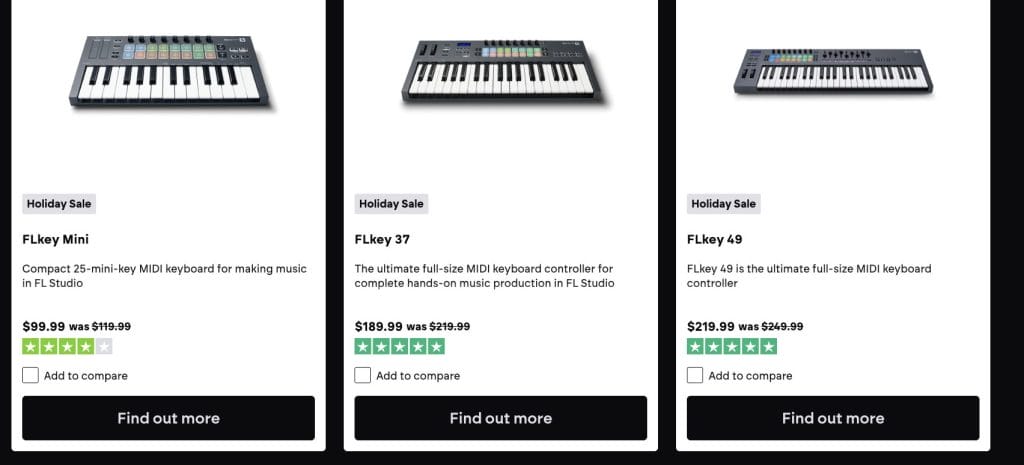 Prices on the FLkey series offered approachable access to FL Studio integration. FLkey Mini landed at 99.99, and the FLkey 37 remained at 189.99. The 49 and 61 models followed suit with reductions that helped bring full-size options into reach. Novation’s Launchpad series also held firm in the sale window. Launchpad Mini, Launchpad X, and Launchpad Pro [MK3] all carried meaningful price drops, which made them suitable for performance-focused setups or compact writing rigs.