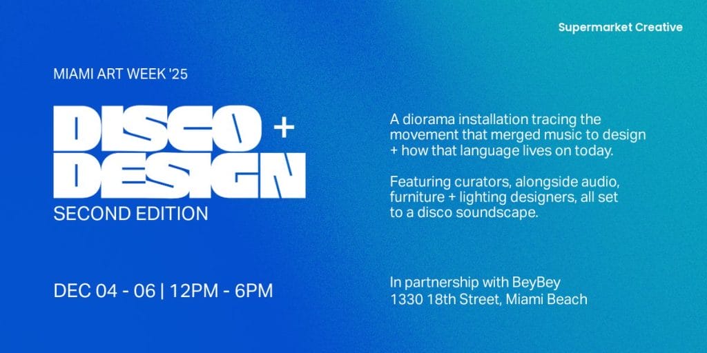 Disco + Design returns to Miami Art Week for its second edition with a new venue, expanded programming, and a refreshed installation that links disco culture with contemporary design practices. The event runs December 4 through December 6 at BeyBey in Miami Beach and centers on a detailed re-creation of a 1970s listening room built inside the restaurant’s hidden back gallery. Visitors can attend vinyl sessions, panel discussions, and design-focused programming that connects music, interiors, lighting, and audio culture through a shared creative approach.