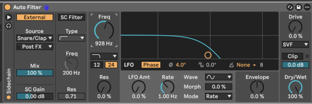 Ableton’s Compressor includes a Sidechain EQ section, and it is one of the most overlooked controls in beginner guides. The Sidechain EQ does not change the sound of your kick, and it changes what the compressor reacts to. If your kick has a lot of low end tail, the compressor may stay engaged longer than you expect, and that can make the ducking feel sluggish.