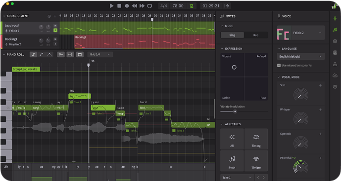 Dreamtonics is best known for Synthesizer V, an AI vocal synthesis platform built specifically for music creators who need expressive, controllable singing voices rather than generic speech output. Unlike text-to-speech tools, Dreamtonics focuses on pitch accuracy, phrasing, dynamics, and emotional nuance, allowing producers to shape performances at a musical level. Notes, lyrics, vibrato, timing, and expression can be edited directly within a piano-roll-style interface, making the workflow familiar to anyone used to DAWs or MIDI programming. High-quality voice databases (developed with real vocalists) deliver natural tone and clarity across genres, from pop and electronic to cinematic and experimental music.