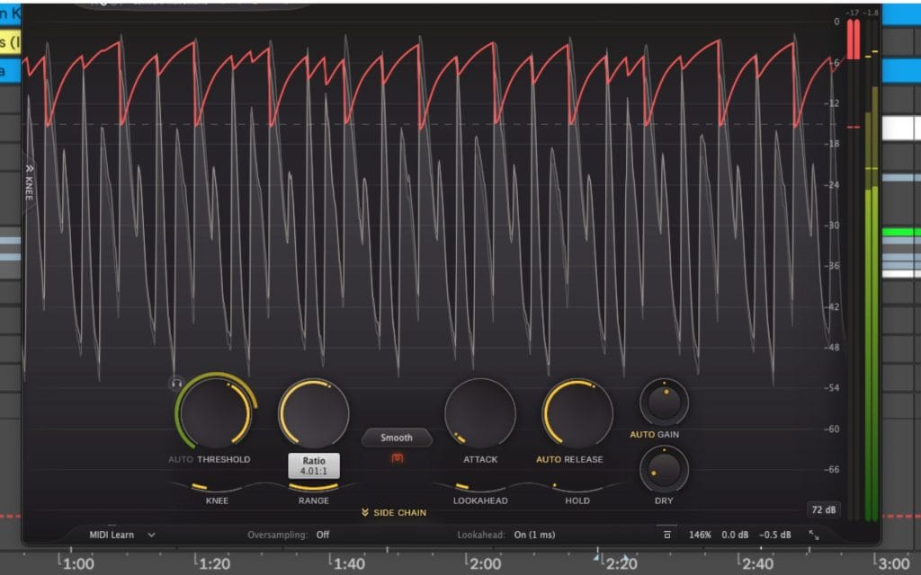 Knee shape changes how ratio enters the picture. A soft knee transitions into the selected ratio across a region around the threshold. Compression starts gradually, then reaches the selected ratio as the signal rises further. Depending on the design, you can see gain reduction begin earlier than you expect, even when the displayed threshold looks untouched.