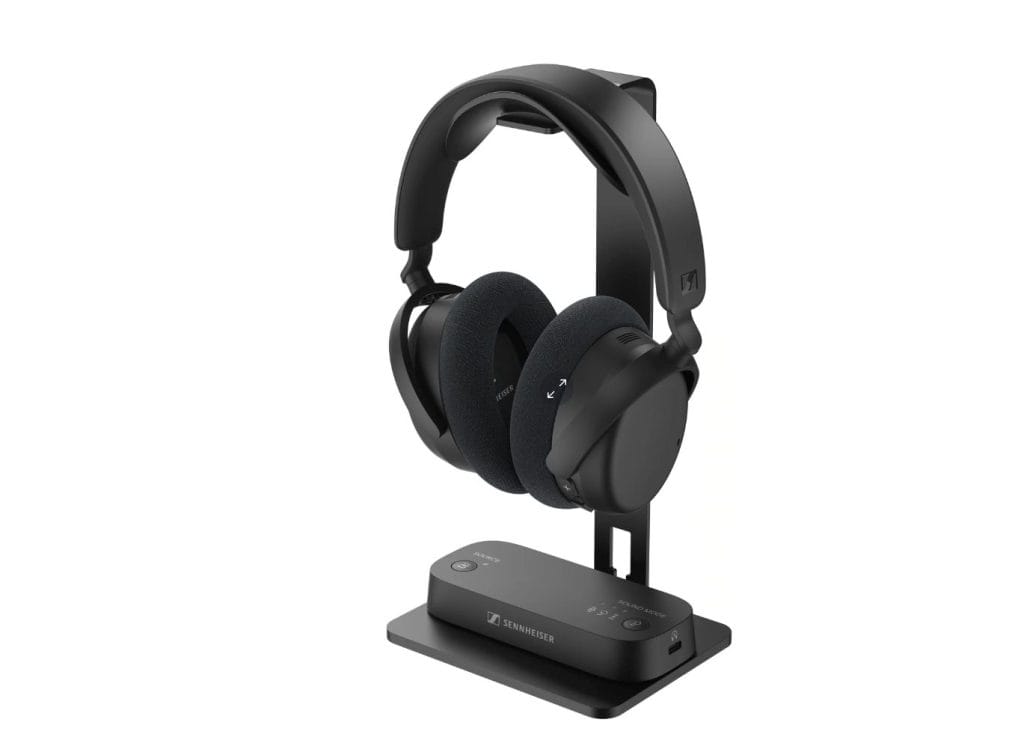 Battery performance supports up to 50 hours of continuous playback, and charging can be handled either through the transmitter’s USB-C port or a standard household charger. Both the ear cushions and battery are user-replaceable, extending the usable lifespan of the system, while the included metal headphone stand keeps the setup organized when not in use.