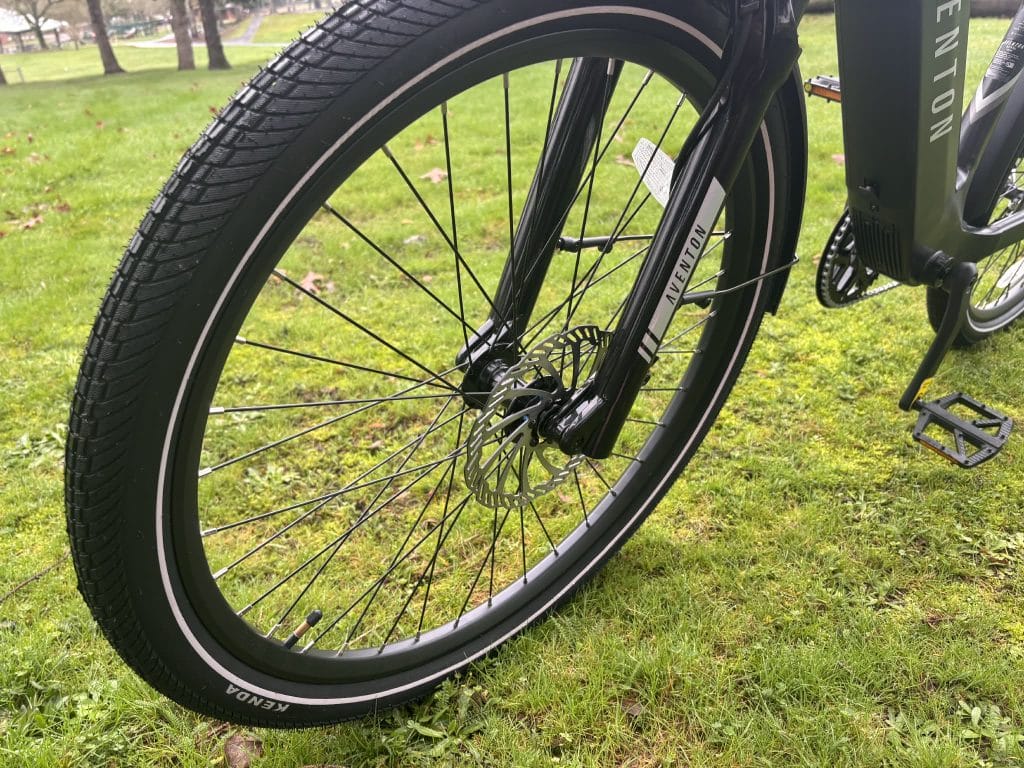 Handling felt stable and maneuverable in the way commuter riders need. Wheel size is 27.5 inches, and the tires are Kenda Kwick Seven-5 Sport in 27.5 x 2.20. I found that size worked well for maintaining efficiency while still giving enough volume for stability. I also appreciated the reflective sidewalls, because visibility is additive in traffic, and sidewall reflection helps from angles you do not always think about until you are riding near cross traffic.