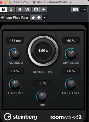 On Elise’s vocals, I used the RoomWorks Effect by Steinberg. This plug-in gives you the freedom to make a different array of reverbs. It helped to create a nice, sweet, warm feeling with her vocals. I used the Vintage Plate reverb setting at 1.66s. Everything was done by ear.