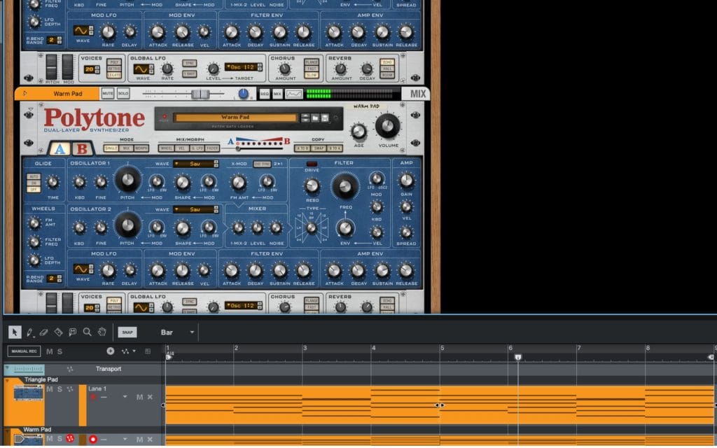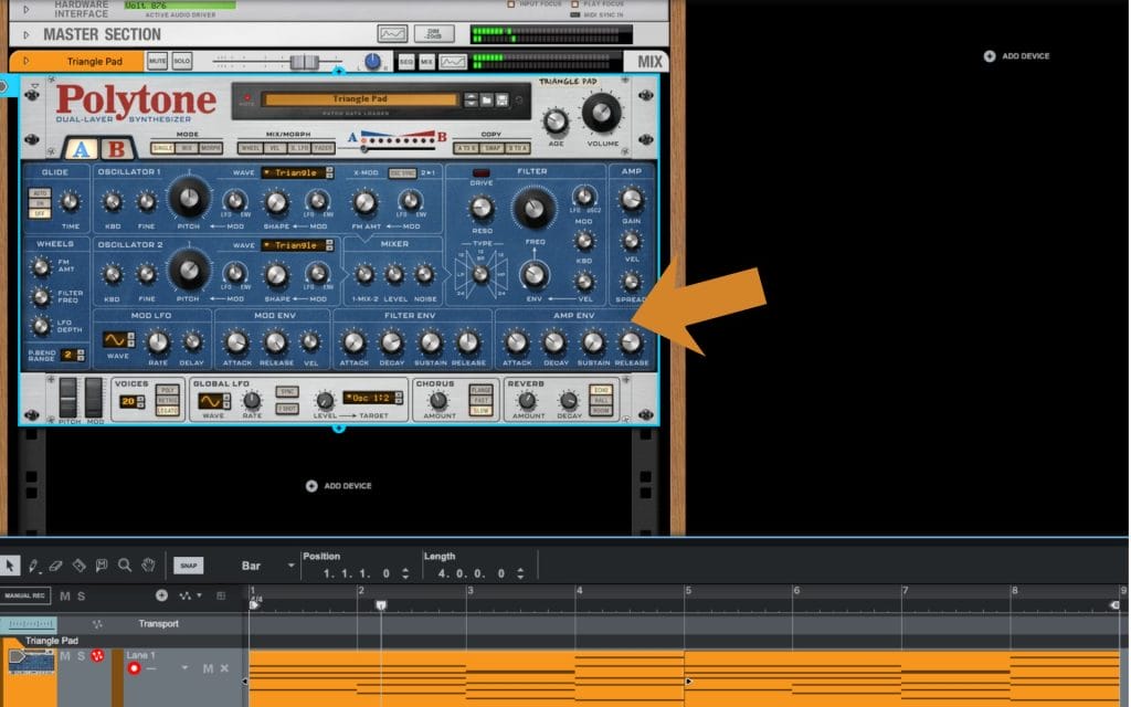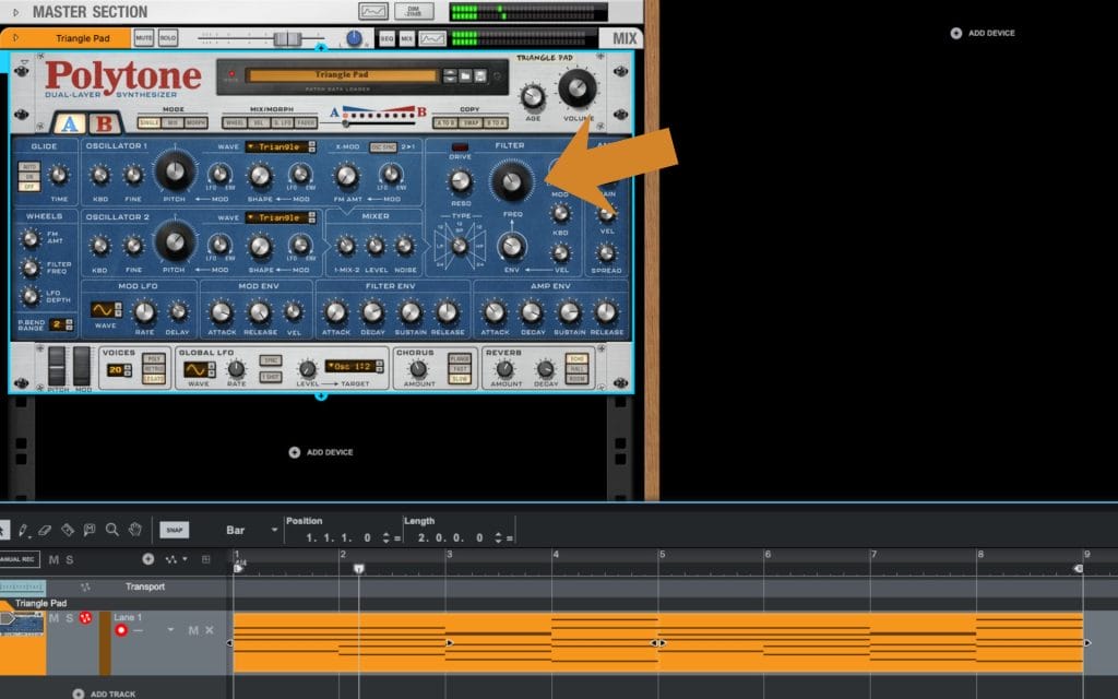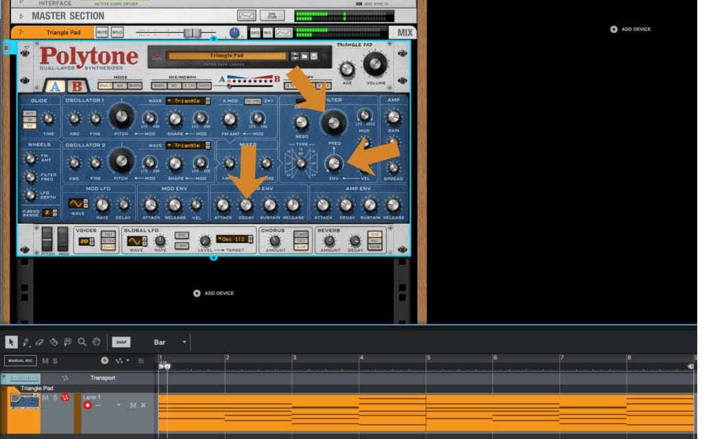 For this example, I spent a few minutes scrolling and landed on the Triangle Pad preset in the Polytone Dual Layer Synth and played a quick 8 bar loop with it (the audio of the preset and the MIDI linked below) but it’s important to stress that these exact same moves can be done on literally any synth; every synth has envelopes and filters which is the lion’s share of what we’ll be tweaking and adjusting as we go over the basics.