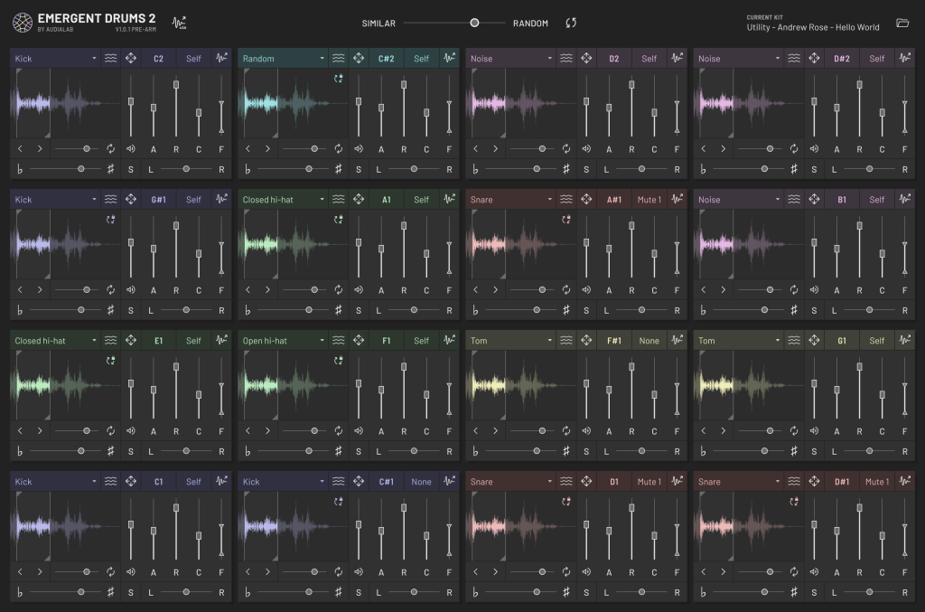 The tool also has enough real production depth that it doesn’t read like a novelty item. It is a 16-pad instrument playable by MIDI, it includes a Similarity Slider (which is a big X-factor) for generating nearby versions of a sound you like, it supports multi-out routing, and it includes shaping functions like clipping, filtering, pitch shifting, trim, attack, and release. There is also a direct drag-and-drop path into a DAW, export options for full kits, bundled presets, user presets, and a compact view for working on one sound at a time.