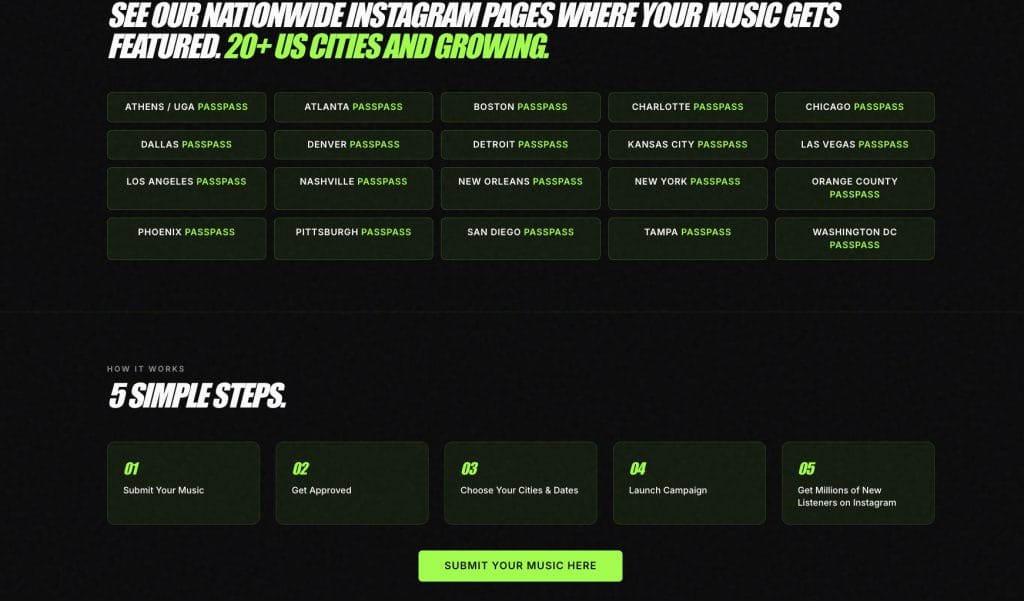 PassPass says its For Artists platform is open to everyone, and the process is built around five basic steps. Artists submit music, approved tracks move into the system, then campaigns can be tailored around specific cities and dates before launching into the company’s broader social and activation network. On paper, that makes this feel closer to a hybrid between local street promo, influencer reach, and experiential marketing than a standard music submission portal.