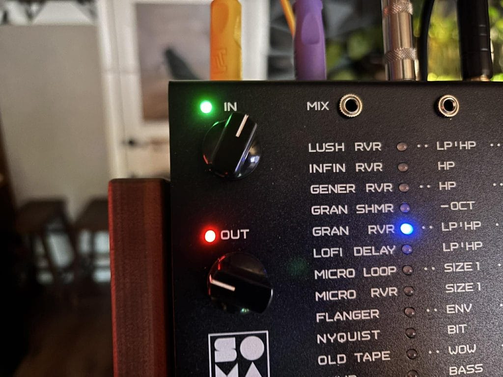 The algorithms are arranged into four LED color groups: reverb-based, delay-based, special effects, and master effects, and that simple grouping helps a lot because it gives the machine an internal logic that becomes second nature after a short stretch of use. I also liked the choice of touch sensors for moving up and down through algorithms, since SOMA uses them in place of buttons for durability. The mix control deserves its fair share of credit, too, because it works across all algorithms and makes it easy to run processing in parallel with the dry signal, which is especially useful for compression, distortion, and filtering.