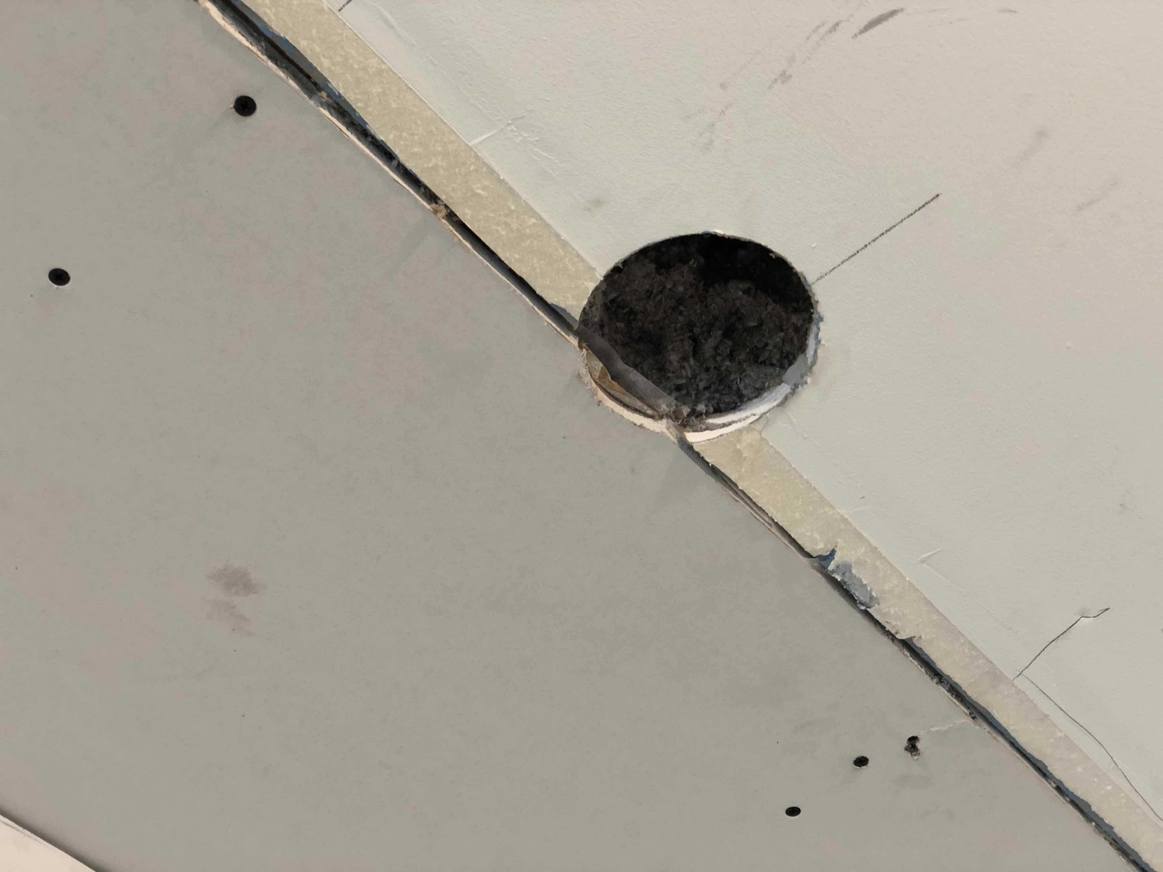 Insulation in the ceiling and front wall was key to our success. Since these were essentially empty cavities behind the drywall that was already there we had to figure out an inexpensive solution to stop the sound.
