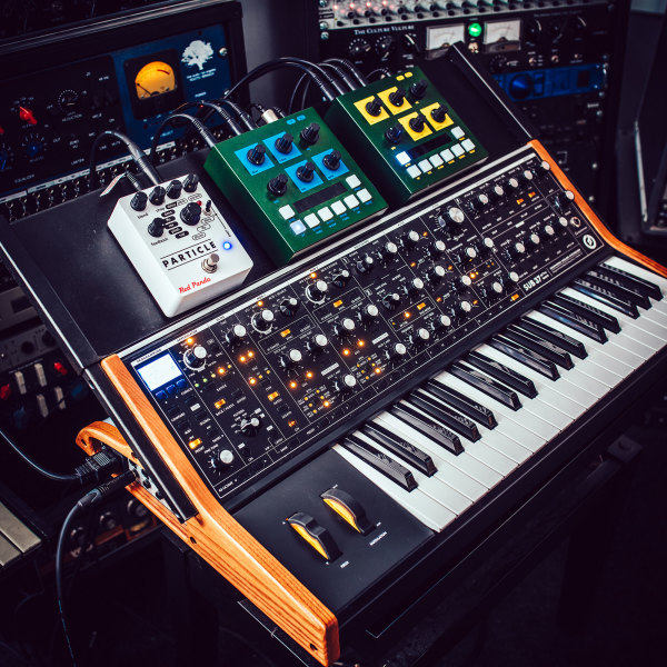 In terms of synths, I could not leave the house without a Moog. I chose the Sub-37 for my live set, just like many other artists, because it sounds great, it has preset memory, it again is fairly compact, and it has a ton of modulation options. The only thing it doesn’t have is internal effects, and so I designed this custom effects tray which can be attached to it, and which currently holds two OTO Machines BIM and BAM reverb and delay units. I am playing the Moog always through these effects. And then I am also using the DSI Prophet-6 as the desktop version (one keyboard is enough to carry…), and I chose it because, again, it sounds fantastic. It’s also a very versatile machine that’s good for basslines, lead synths, chords, pads, and everything in between.